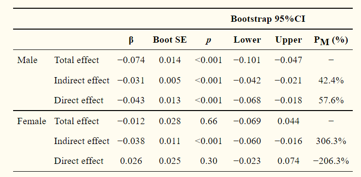 <結果>1日あたりのPSSスコア,およびPSQIスコアはそれぞれ18.1±6.9(男性:17.5±6.8;女性:19.3±7.1),4.8±2.7(男性:4.7±2.6;女性:5.2±2.8)であった.女子学生と比較して男子学生では,より多くの身体活動,より少ないストレス,そしてより良い睡眠の質が報告された.さらに,男性における総効果,直接的効果,および間接効果のブートストラップされたCIsはすべて統計的に有意であり,パーセンテージは42.4%(部分的な媒介効果)であった.女性における間接効果のブートストラップされたCIのみが統計的に有意であり,パーセンテージは306.3%(完全な媒介効果)であった.