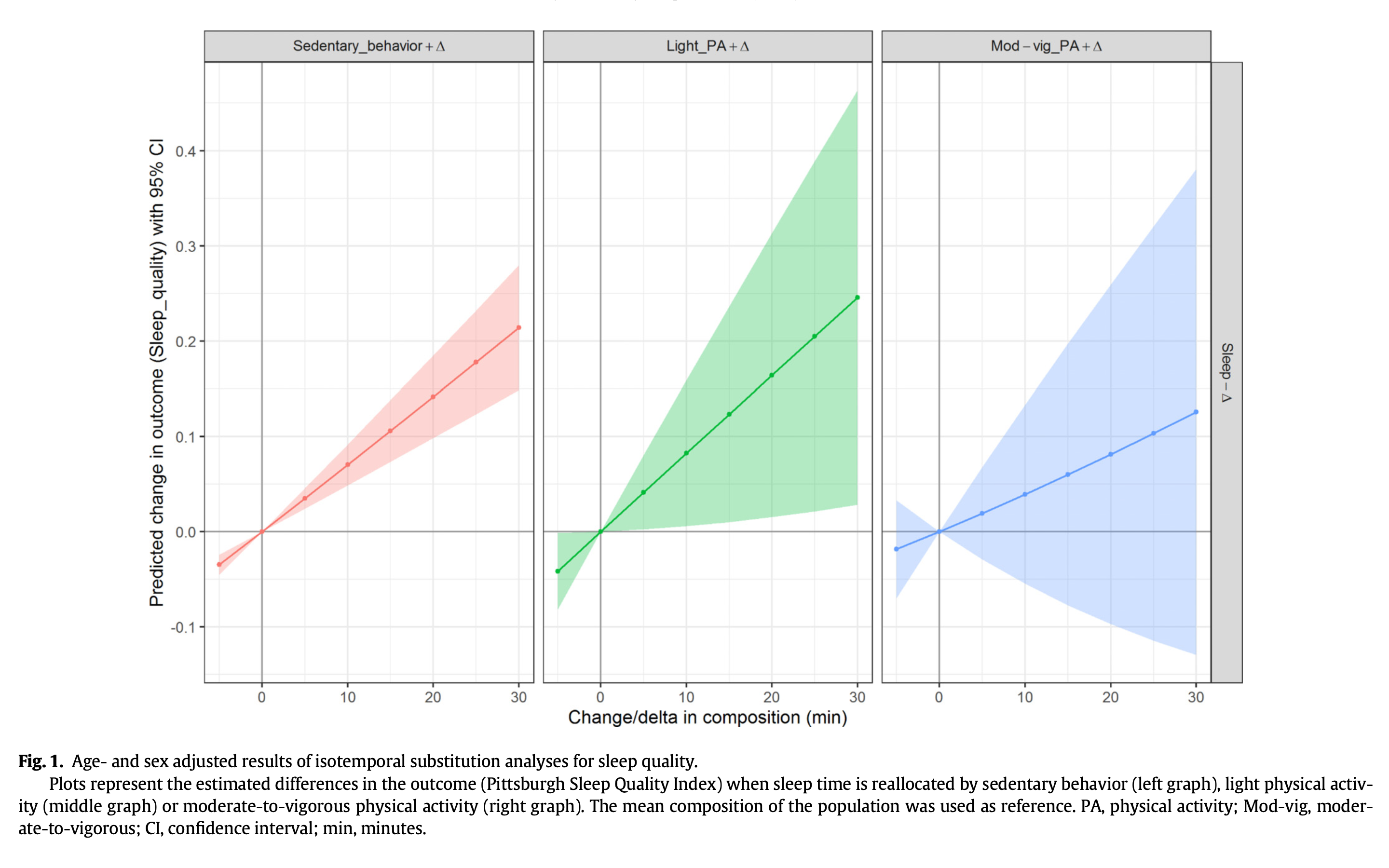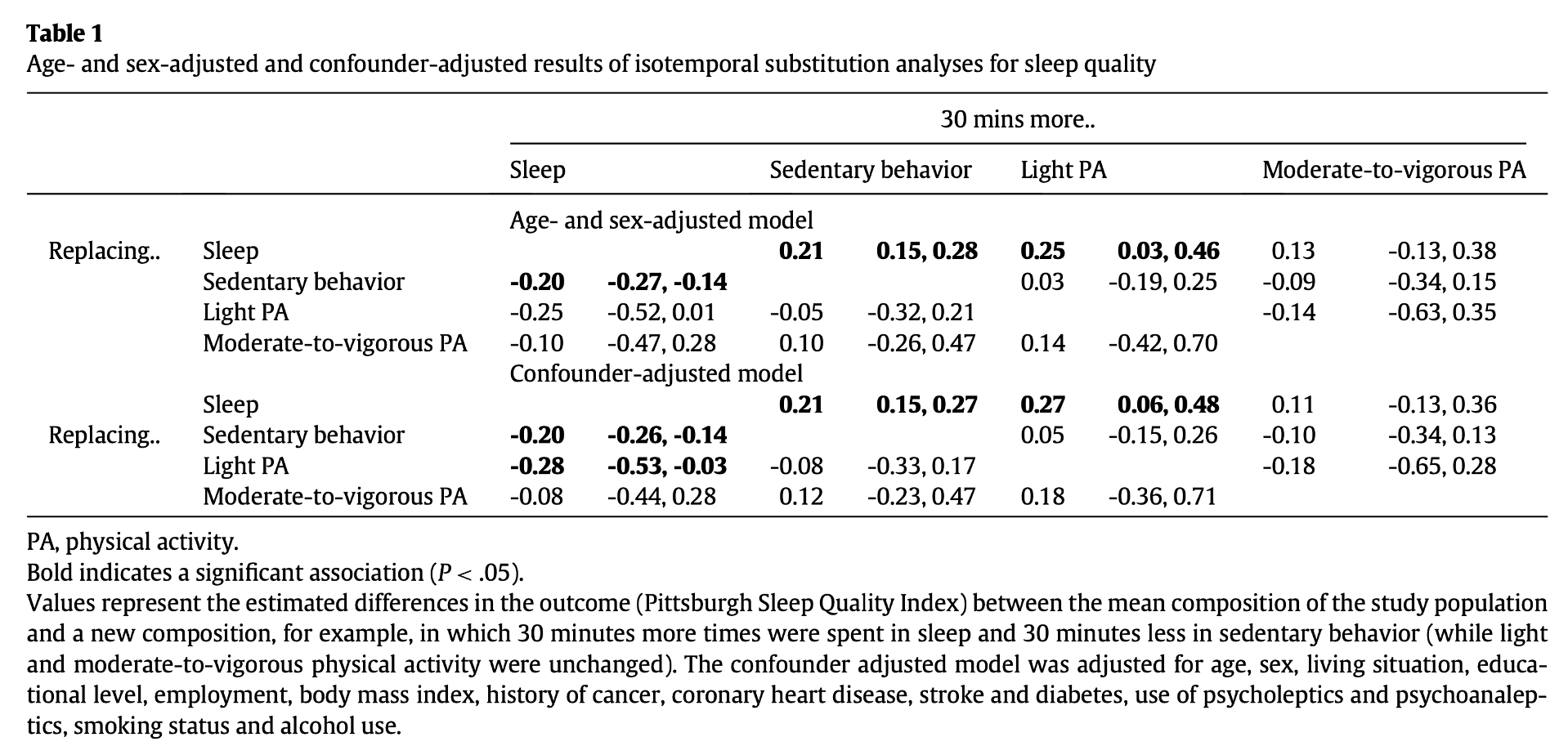 Time spent in physical activity, sedentary behavior, and sleep: Associations with self-rated sleep quality in middle-aged and older adults./身体活動、座位行動および睡眠に費やす時間:中高年成人と高齢者における主観的睡眠の質との関連